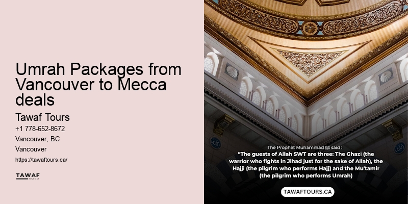 Just as every journey begins with a single step, your spiritual quest embarking from Vancouver to the sacred lands through Tawaf Tours' comprehensive Umrah package promises an experience unlike any other. But it's not just the practicalities that make their service stand out; they also offer a range of spiritual enrichment activities to enhance your pilgrimage experience. Learn more about Umrah Packages from Vancouver to Mecca deals here Tawaf Tours understands that the journey is as important as the destination, and they've gone to great lengths to ensure that your flight experience enhances your spiritual pilgrimage. From preparing for your departure to experiencing the pilgrimage's deeply personal impact, our tailored approach ensures your journey is as fulfilling as it is enlightening. Read more about Tawaf Tours here. Choosing Umrah offers you a unique spiritual journey that deeply connects you with your faith.