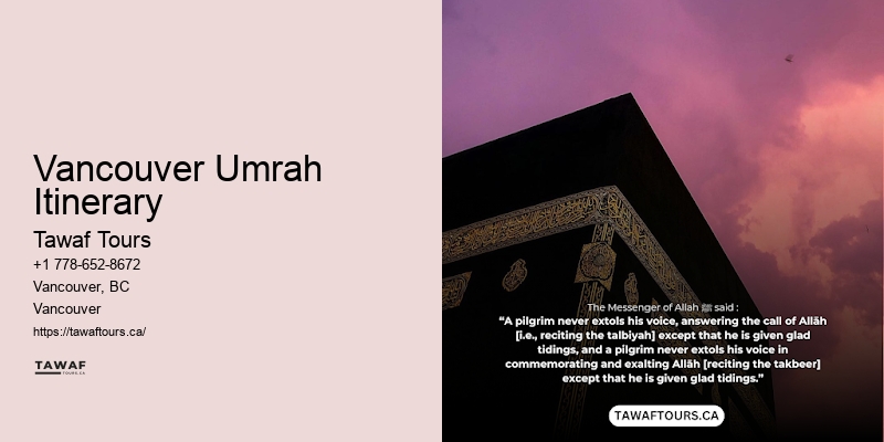 They ensured we understood every step of our Umrah, making it a deeply personal and enriching experience.'Finally, Michael concluded, 'From Vancouver Umrah Itinerary to Mecca, every detail was handled with care. As you contemplate this spiritual journey, you'll find that choosing Tawaf Tours isn't just about the convenience of departing from closer to home; it's about embarking on a path that has been thoughtfully designed to deepen your faith and understanding. This aspect provides a more intimate and contemplative experience, away from the vast crowds of Hajj. From the moment you decide to embark on this spiritual trip from Vancouver Umrah Itinerary, you're not just another traveler; you're part of the Tawaf family. You're stepping away from the distractions of daily life to connect with your faith on a deeper level.